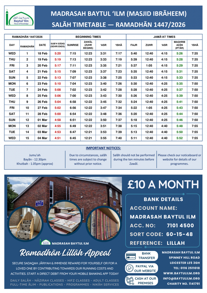 Home About Us Masjid Madrasah Publications Donate Children’s Page Subscribe Noticeboard Ramadhan Schedule Ramadhan Timetable 1 Ramadhan Timetable 2 Donation Appeal Sadaqatul Fitr Featured Article Hadith of the Month Adult Classes Full-Time Alimiyyah Course Nikah Ceremony Service Main Menu Links Other Useful Links Home About Masjid Madrasah Publications Contact Us Donate Children’s Page Spare Attendance Term 5 Noticeboard Gallery Prayer Timetable Alim Class Gift Aid Form Students of the Month Attendance Lists Full Yearly Planners Masjid Receiver Frequency 453.525 Charity Registration Number: 1141791